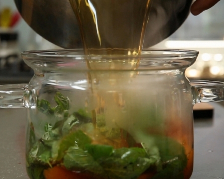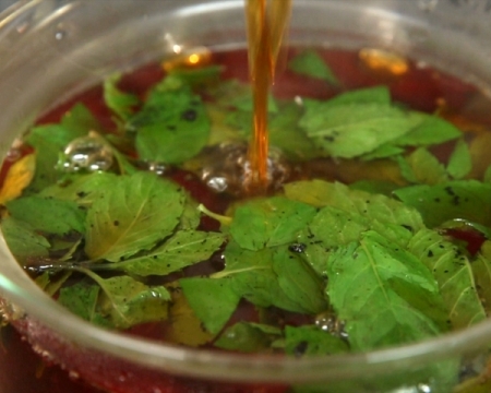 Поръсват се с листа мента и се заливат с горещия чай.