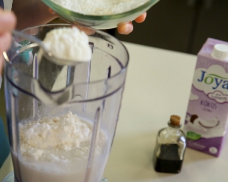 В шейкър кана сложете- кокосовата напитка, брашно, захар, бакпулвер, ванилов екстракт и сол. Разбъркайте докато се получи еднородна смес.