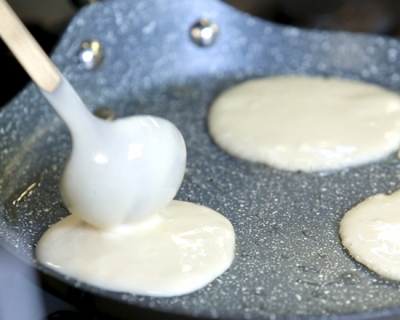В тиган за палачинки загрейте кокосово масло. С черпак вземете от палачинковата смес.
