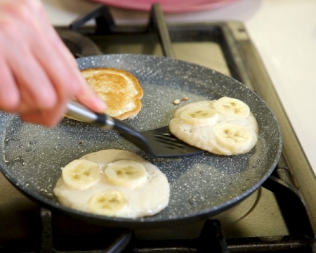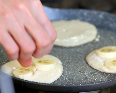 Когато дойде време за обръщане сложете в палачинката парчета банан, като ги притиснете.